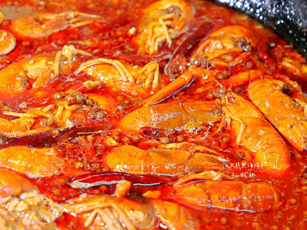 看著大鐵鍋裡小龍蝦正浸在辣海中翻滾,