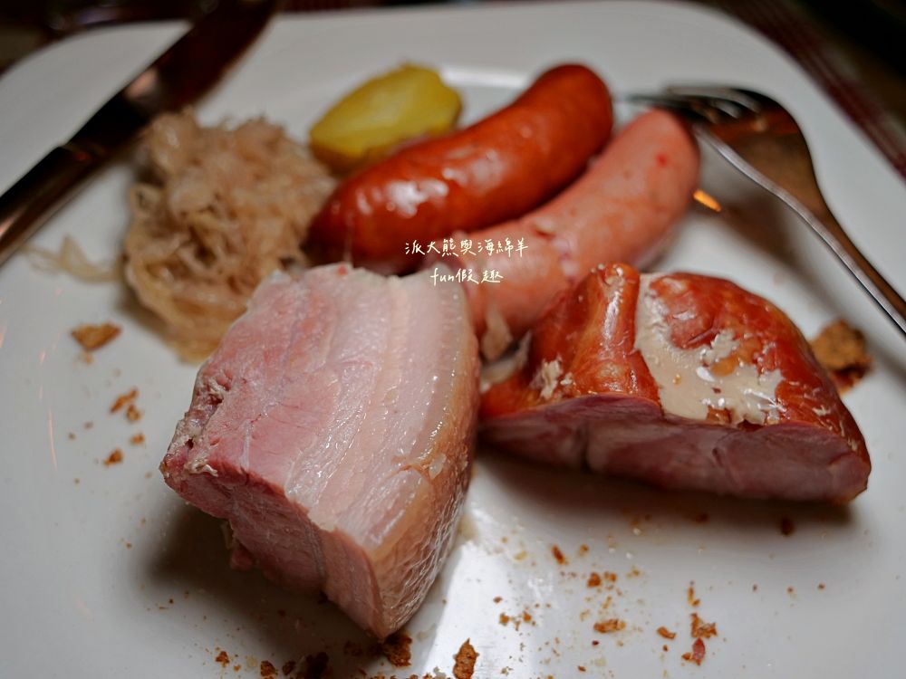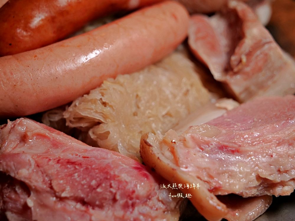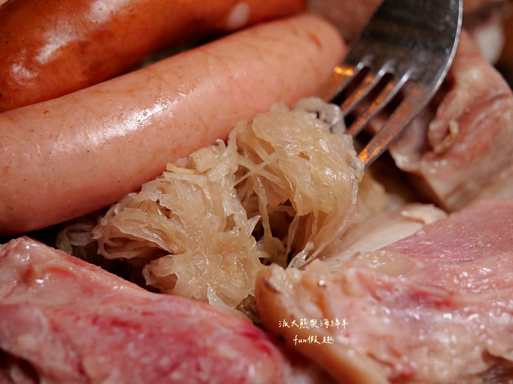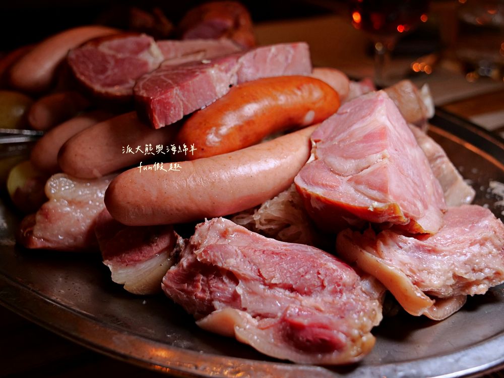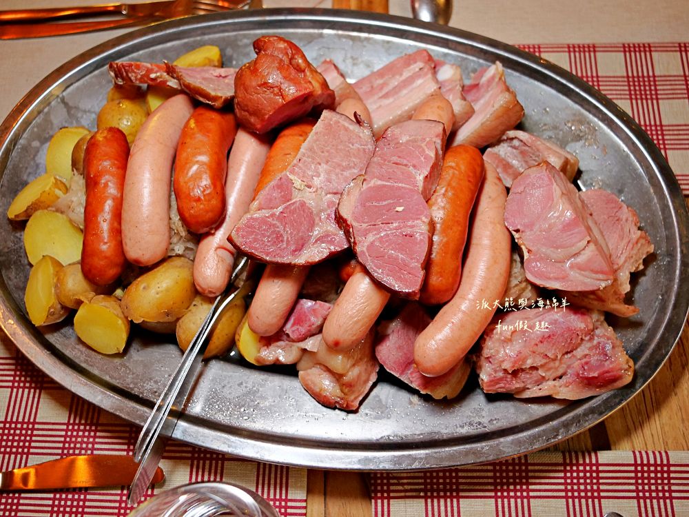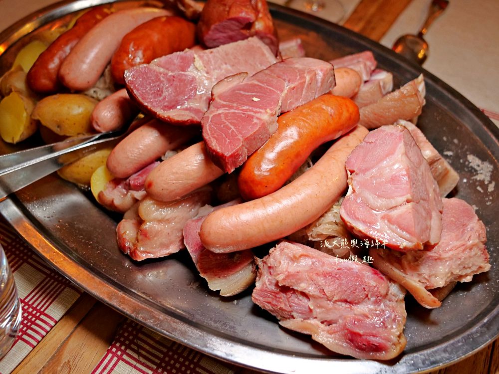 這道阿爾薩斯酸菜拼肉盤包含培根、豬腳、