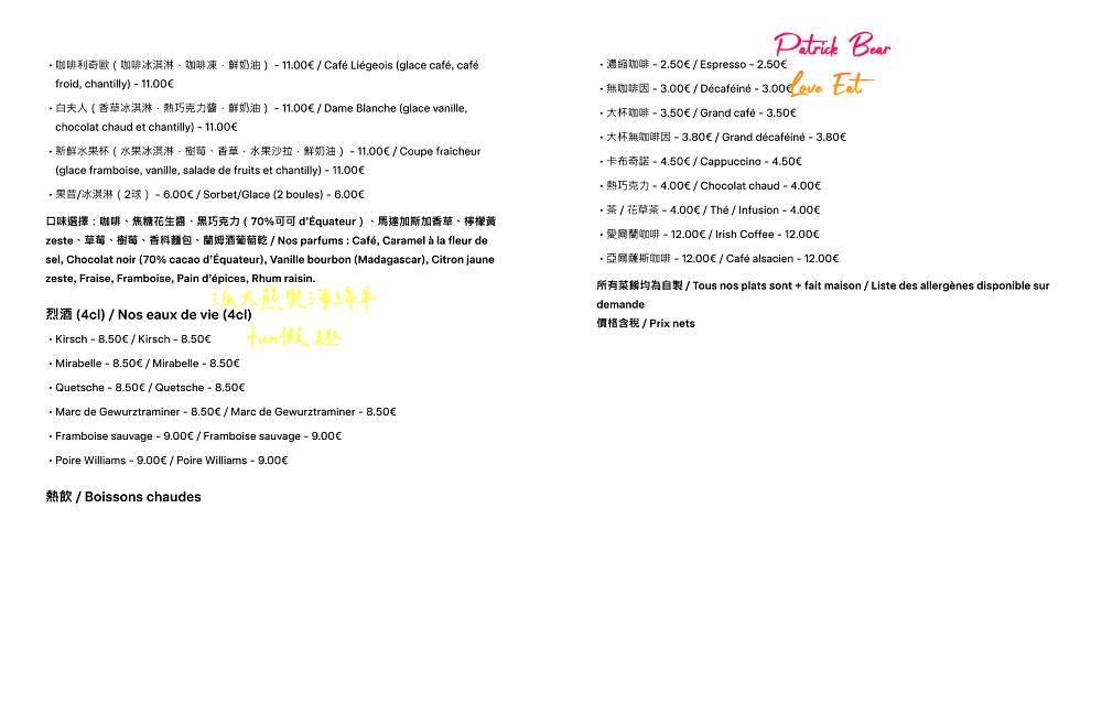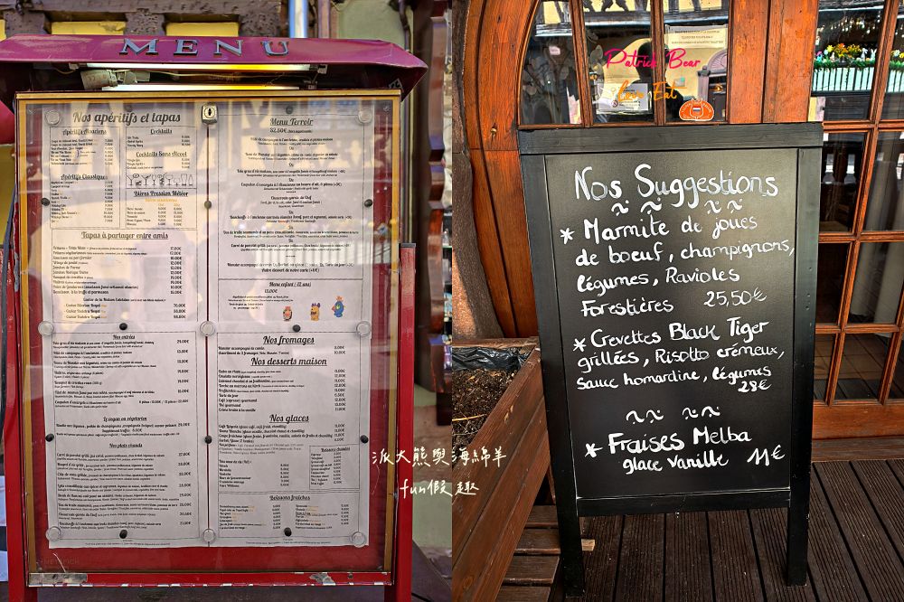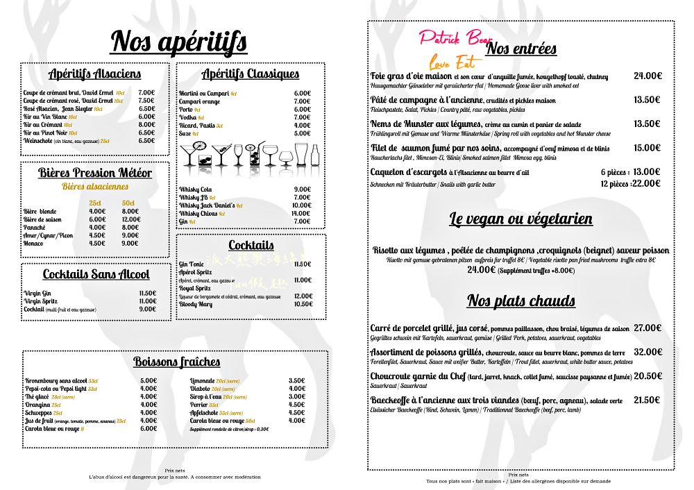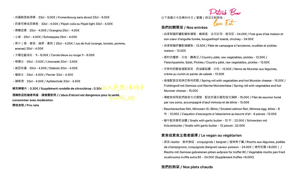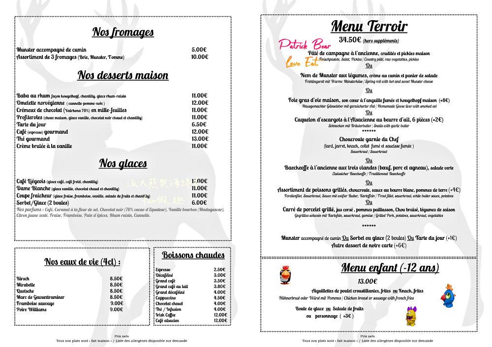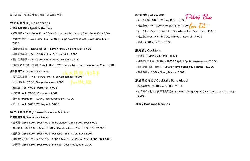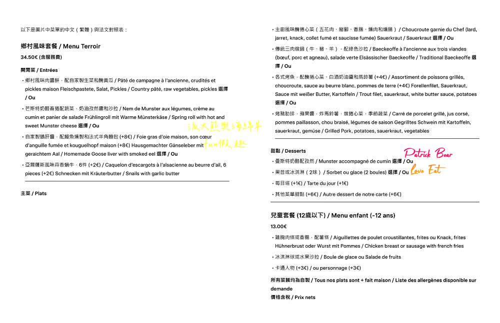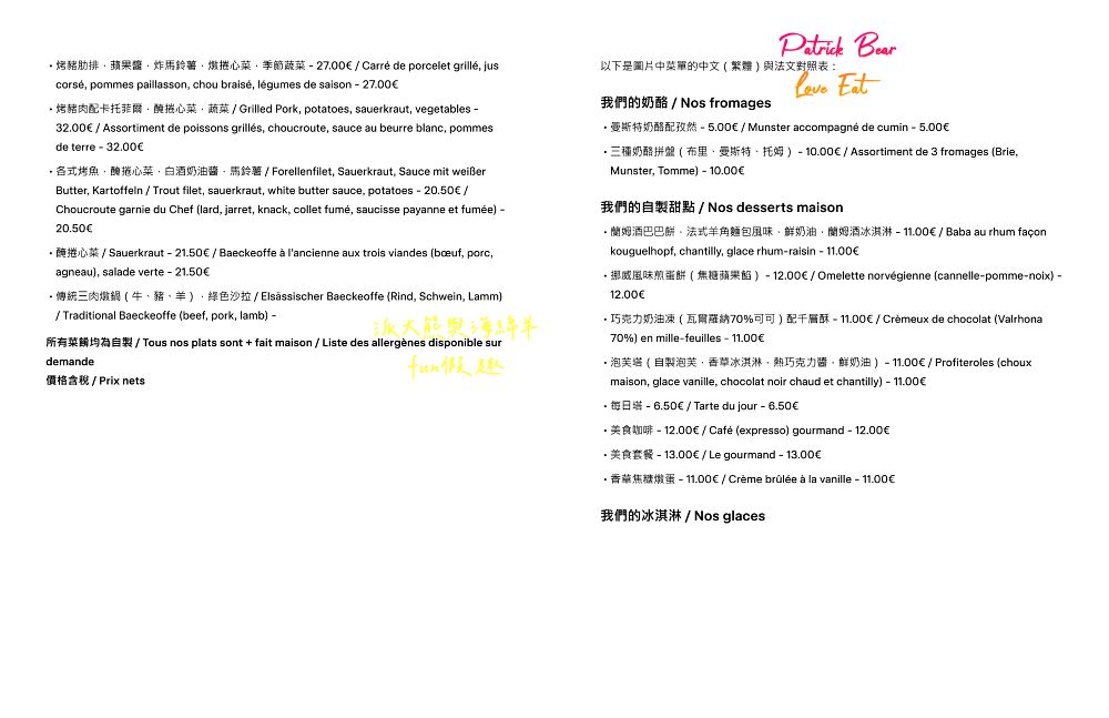 主餐價格約 20.5歐元起,套餐(含前菜、主餐與甜點)約 34.5 歐元,屬於中價位餐廳。推薦選擇「鄉村風味套餐」,一次體驗多道阿爾薩斯經典菜色。