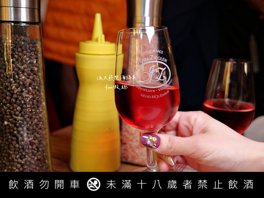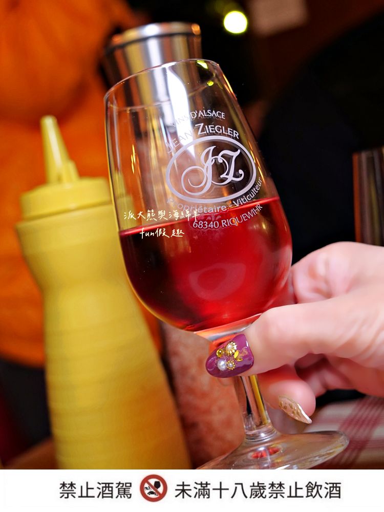 餐廳提供當地酒莊出產的黑皮諾紅酒(Pinot Noir) 作為餐前酒,甜酸平衡、單寧柔順,特別適合搭配肉類料理如酸菜拼肉盤,展現阿爾薩斯地區的葡萄酒特色。