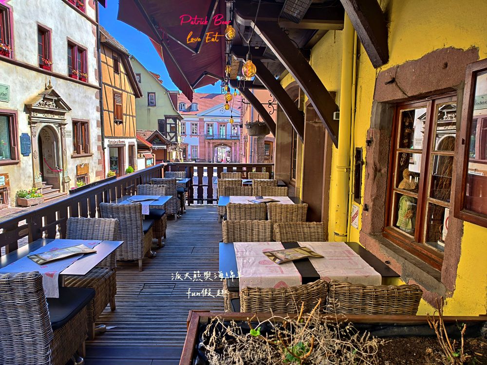 餐廳內部以深色木質橫樑、石砌牆面與彩色玻璃窗打造中世紀氛圍,外觀呈現阿爾薩斯傳統建築風格。露台設有藤椅與花紋桌布,整體空間典雅溫馨,宛如置身歐洲古鎮的明信片場景。