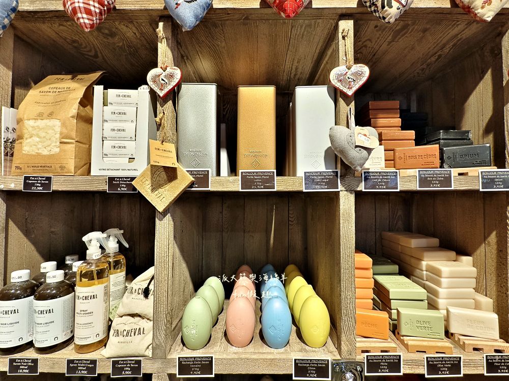 店內主打法國經典馬賽香皂(Savon de Marseille),以純植物油製成,溫和無刺激,另有驢奶香皂、甜杏仁油香皂、彩蛋造型皂及香氛蠟燭等多樣商品。